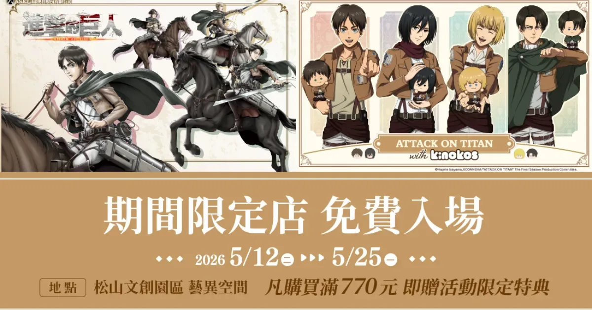 《進擊的巨人》快閃店將於 5 月 12 日起在松山文創園區盛大登場。本次活動推出全新繪製周邊,包含展現調查兵團英姿的「騎馬系列」、童趣的「旋轉木馬主題」,以及療癒的「與 KINOKOS 一起」系列。