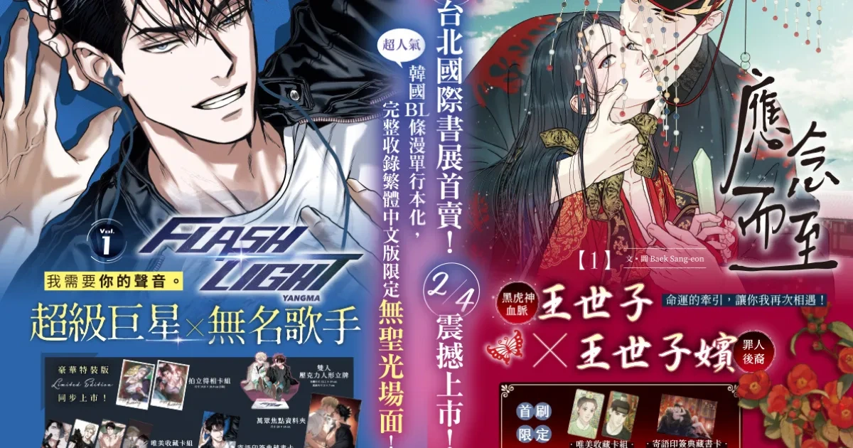 2026 台北國際書展最受矚目的焦點即將引爆!台灣角川將首度推出兩部話題度爆表的韓國人氣 BL 韓漫《FLASHLIGHT 1》、《應念而至 1》單行本,完整收錄火辣無聖光畫面,掀起粉絲熱情狂歡。