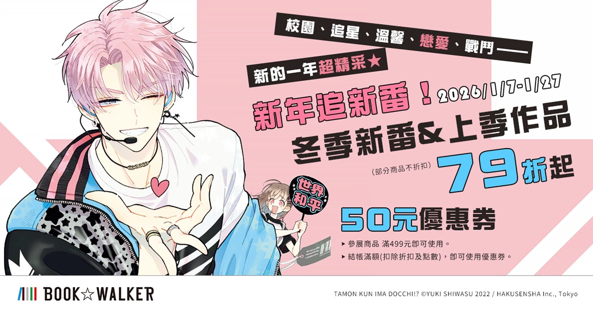 BOOK☆WALKER「新年追新番!冬季新番&上季作品書展」1 月 7 日–1 月 27 登場,參展 79 折起並可領 50 元券;另推套書 8 折與新會員券最高 64 折,尖端《岳》同步 75 折。