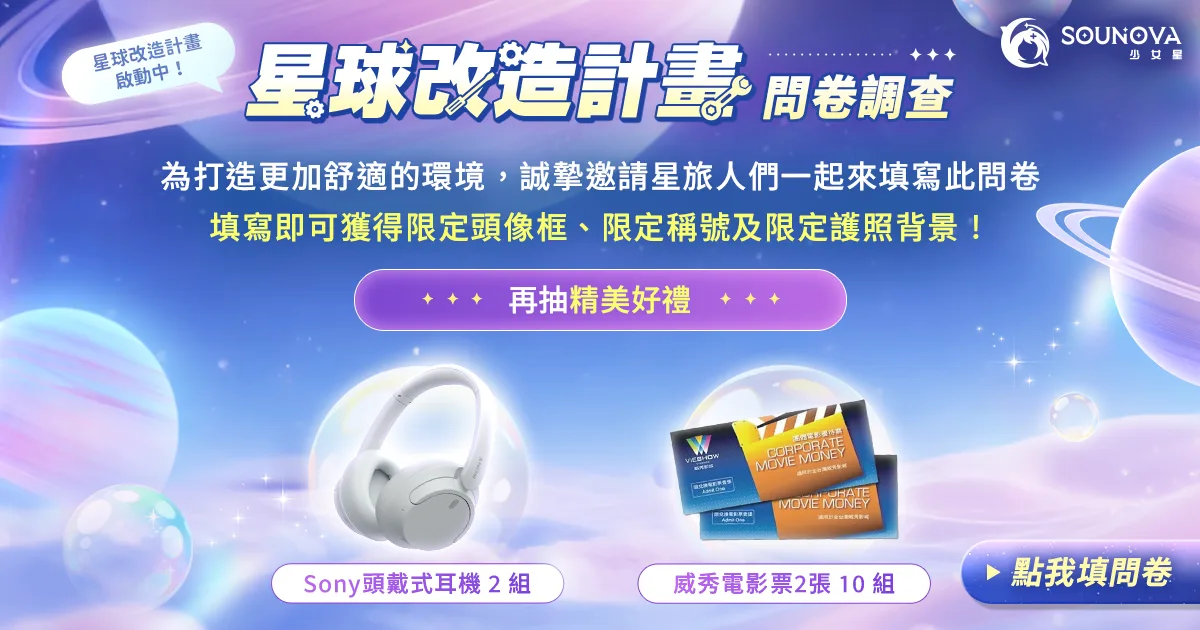 SouNova 少女星即將開啟星球改造計畫,即日起至 2026 年 4 月 30 日止,填寫問卷再抽精美豪禮,邀請星旅人們一同建造更優質的交流場域。
