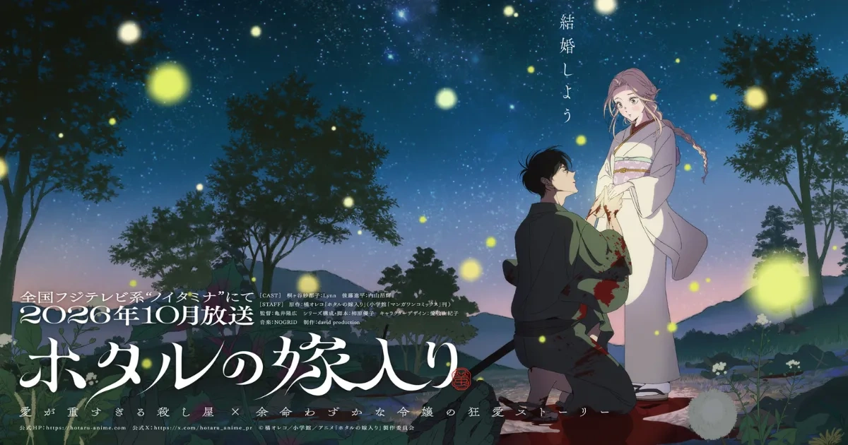 預計於 10 月開播的秋季新番《螢火蟲的出嫁》公開男女主角聲優陣容,由內山昂輝與 Lynn 聯手演繹冷酷殺手與千金小姐之間的禁忌狂愛,官方同步釋出充滿明治時代氛圍的第二波主視覺圖與前導預告。