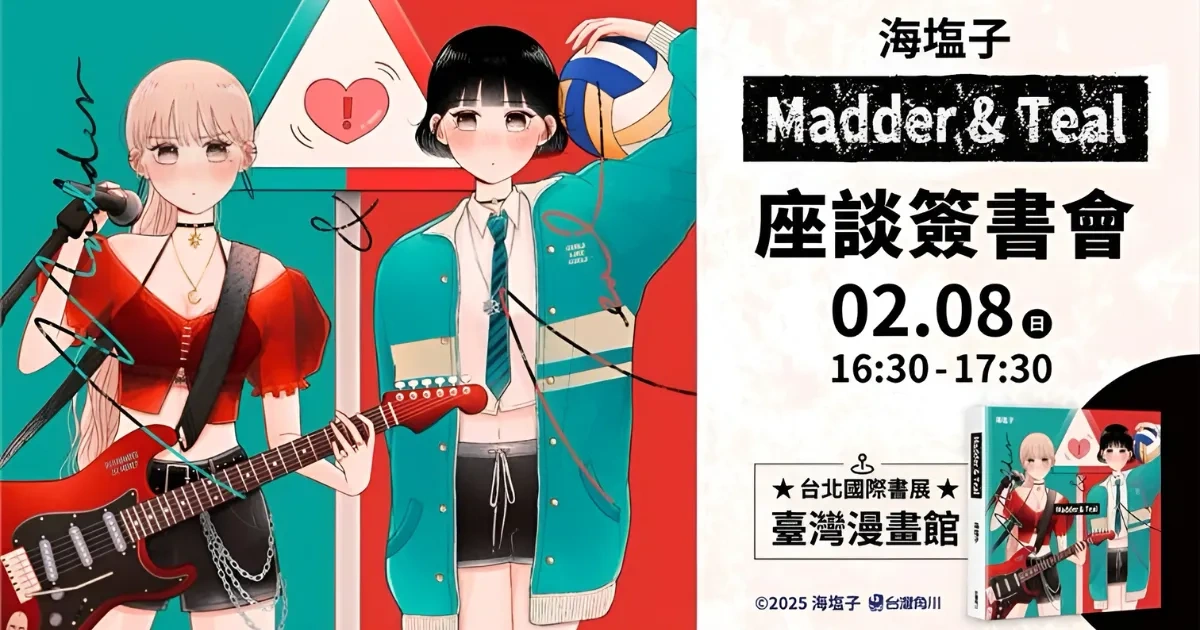 台灣漫畫家海塩子筆下又酸又甜的校園百合人氣之作《Madder & Teal》,確定將於 2026 年台北國際書展舉辦首場座談暨簽書會活動。2 月 8 日漫畫家海塩子將再次與讀者沉浸於溫柔的青春戀曲。