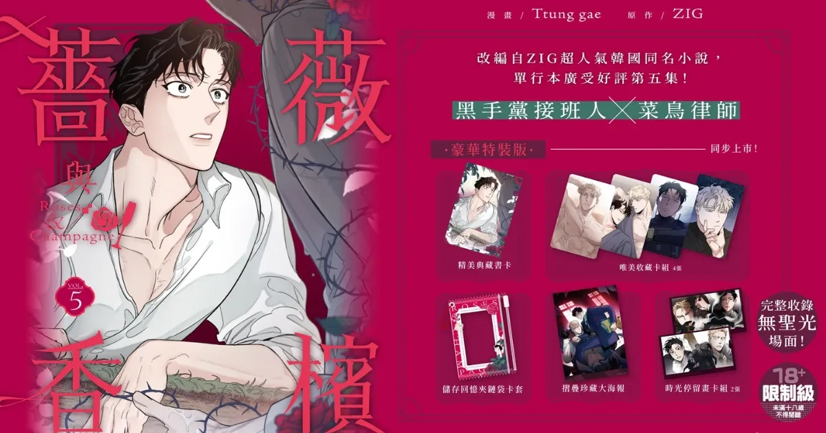 超人氣韓國 BL 漫畫《薔薇與香檳 5》於 3 月 16 日發售!黑手黨與菜鳥律師的危險愛戀再升級!不只完整收錄無聖光場面,更同步推出豪華特裝版,內含限定卡套、海報與收藏卡等精美特典,粉絲千萬別錯過!