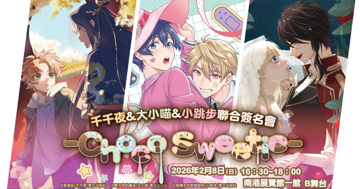 迎接 2026 年台北國際動漫節,東立出版社宣布舉辦「Choco Sweetie」聯合簽名會,集結千千夜、大小喵與小跳步三位作者,採事前登記抽選制,入場即可獲得限定親簽簽名板,現已開放登記抽選!