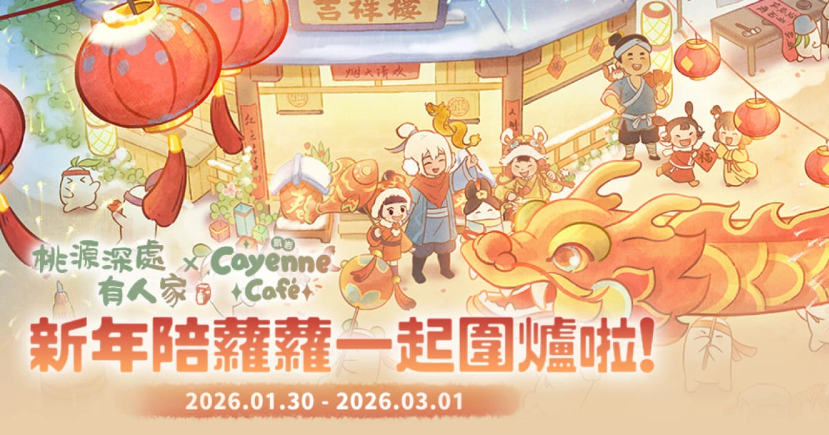 治癒系經營模擬遊戲《桃源深處有人家》與 Cayenne Café 凱岩咖啡首度聯手,打造為期一個月的主題餐廳,將遊戲中靜謐溫馨的田園時光帶到現實,與玩家一同迎接農曆新春!