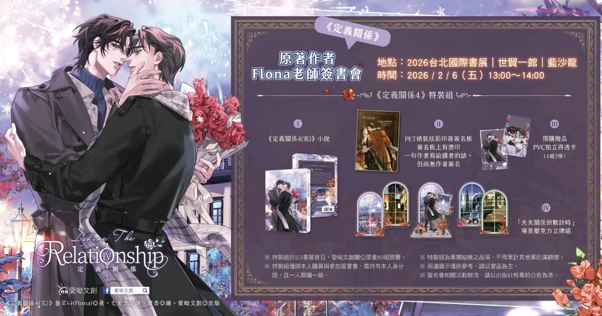 韓國超人氣雙 A 戀小說《定義關係》簽書會活動辦法正式公開!愛呦文創特邀《定義關係》小說作者 Flona 老師於台北國際書展舉辦簽名會,與讀者一同見證艾許和卡萊爾唯美愛情的最終章。